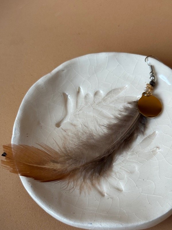 Aros realizados de manera artesanal con pluma exótica y dije circular en acero dorado con grabado de inicial incluido