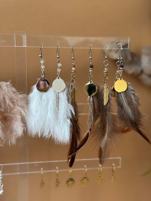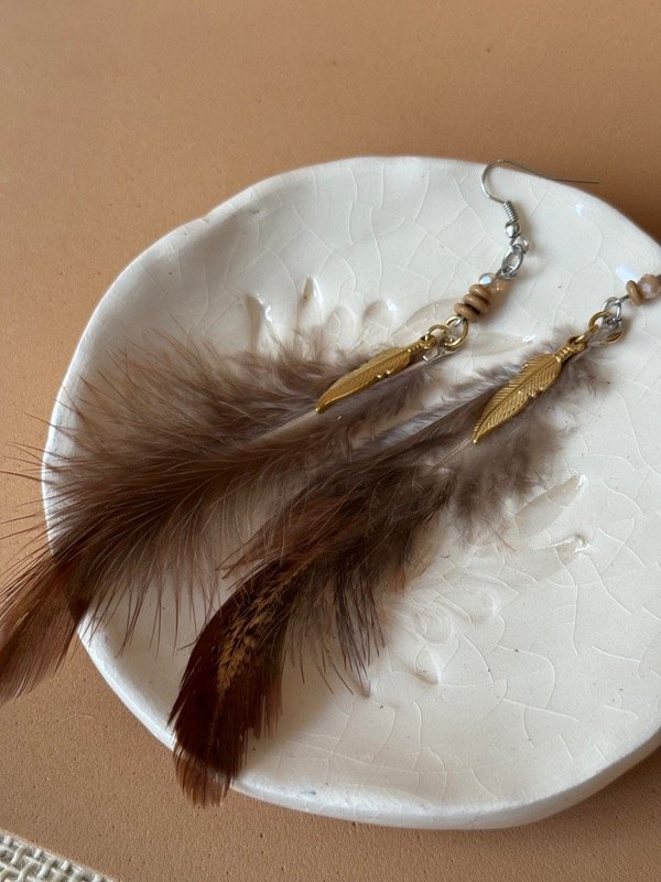 Aros realizados de manera artesanal con pluma exótica y dije pluma dorada