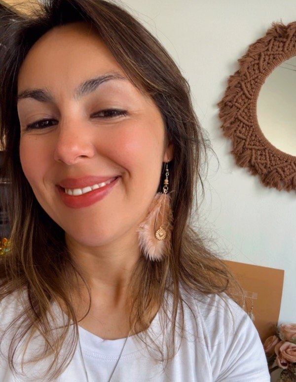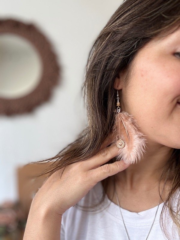 Aros realizados de manera artesanal con pluma rosa y dije circular con grabado de inicial incluido